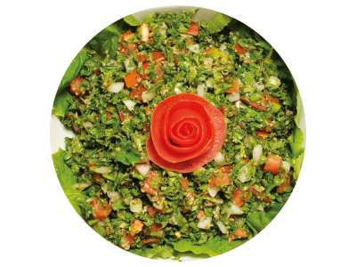 Persil, tomate, oignon, blé concassé, jus de citron et huile d’olive.